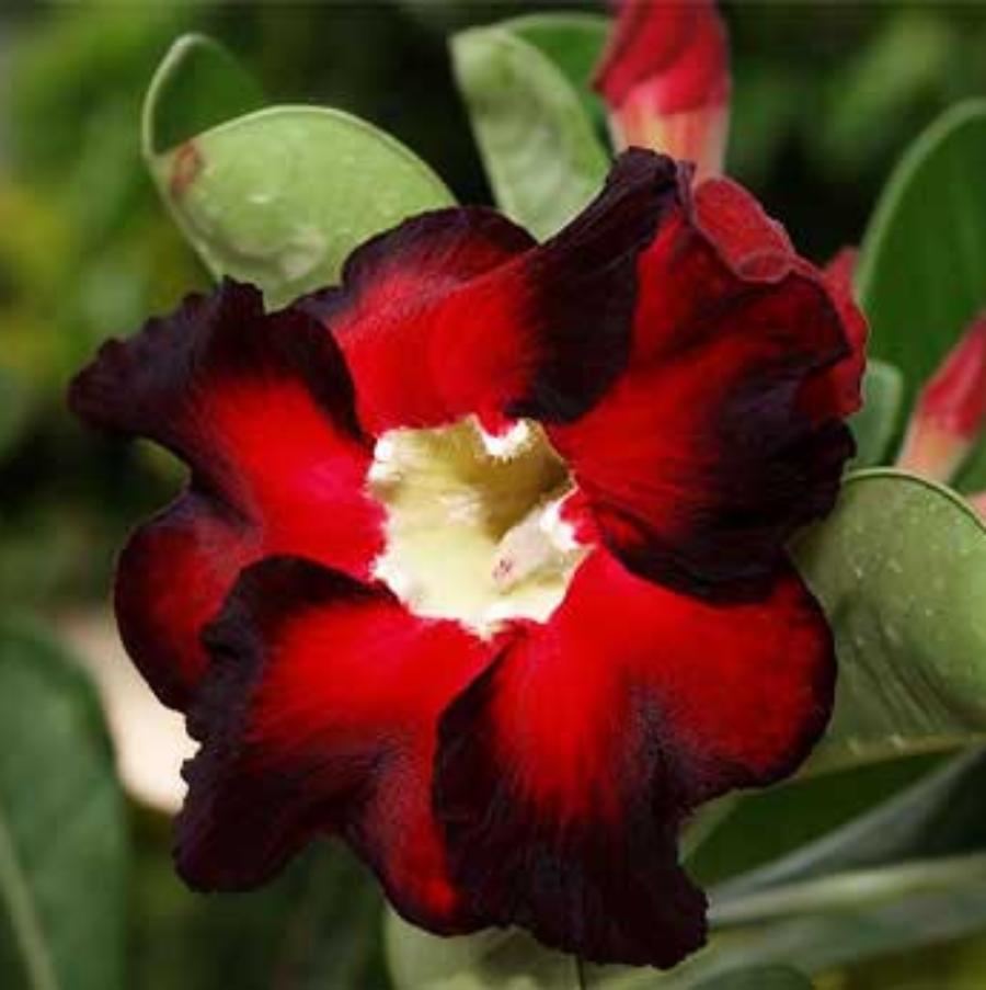 Adenium Hip Hop - небольшое деревце. Ствол мясистый, листья зеленые, огромные. Зацветает сорт в возрасте 1,5-2 года, продолжительность цветения колеблется от 2-3 месяцев до года. Цветки соединяют в себе ярко-красный и темный, почти черный окрасы. Глаз цветка белый с желтым оттенком.