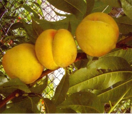 Персик Донецкий желтый - дерево сильнорослое с густой округлой кроной. Зимостойкость хорошая. Плоды округлые или широкоовальные. Кожица со слабым опушением, бледно-желтая, у недозрелых плодов зеленовато-желтая, на освеженной стороне с красивым карминно-красным румянцем. Мякоть зеленовато-желтая, у кожицы желто-оранжевая, без красноты у косточки, плотная, сочная, очень сладкая, с приятным ароматом.