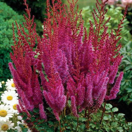 Саженцы астильбы Purpurkerze – одного из самых высокорослых сортов – являются очень сильными и мощными декоративными растениями, которые сохраняют декоративность на протяжении всего сезона. Зазубренные жесткие листья украшены благородным бронзовым отливом. Саженцы этой астильбы любят более солнечные места. Также растение хорошо растет в полутени. Этому морозостойкому сорту не требуется укрытия на зиму.