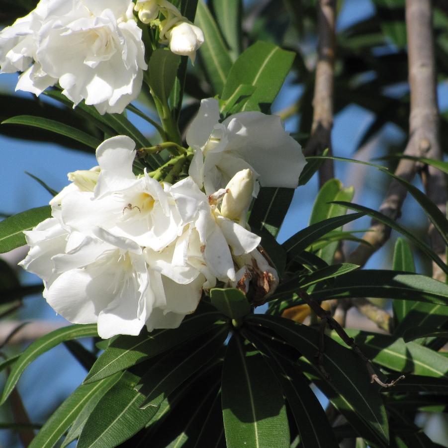 Олеандр обыкновенный Альбум Пленум (лат. Nerium oleander Album Plenum) - крупный декоративный вечнозеленый кустарник. Стебли серо-коричневые, толстые, сильные. Листья ланцетовидной формы, темно-зеленые, очень узкие и длинные. Цветки полумахровые, часто двойные, белого, иногда с кремовыми оттенками цвета. Лепестки широкие. Внимание! Олеандр - ядовитое растение, поэтому при его культивировании требуется осторожность.